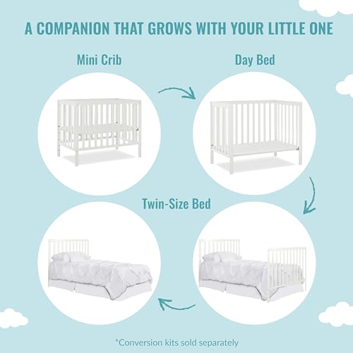 CONVERTIBILITY OPTIONS: Keep pace with your growing child’s changing needs with the Edgewood 4-in-1 Convertible Mini Crib, Starting as a mini crib, you can convert it into a mini daybed and twin-size bed (bed rails sold separately)