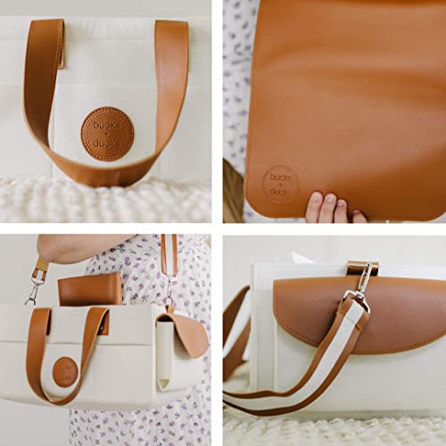 Extra Pockets: Two large side pockets with magnetic faux leather covers and six small front and back pockets to use as diaper bag organizing pouches. The extra diaper pail pockets increase quick access to every day baby changing station essentials.