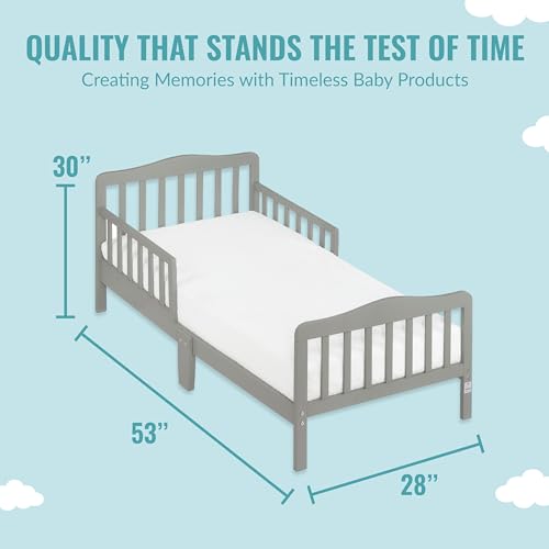 Let your little one transition from a crib to big bed with ease thanks to the Dream On Me Classic Design Toddler Bed! The bed sits low to the floor making getting in and out easy. It comes with two side safety rails and is reinforced for stability with a center leg. All user manuals and assembly tools are provided with the crib at purchase. Its design is classic and minimalist – the solid wooden bed features gently arched head- and foot-boards and smoothly curving rails and beams, making it a beautifully crafted piece of furniture. It is available in non-toxic, elegant finishes, making it perfect to fit in the nursery of your dreams. Safety is always our top priority. The toddler bed is JPMA certified and designed to meet/exceed all applicable ASTM and CPSC standards. It is free of phthalates, latex, lead and BPA and is ergonomic, stable and sturdy. The dimensions are 53 L x 28 W x 30 H inches and it weighs 16.5 lbs. It can accommodate a child of up to 50lbs. Choose any Dream On Me non-toxic, Greenguard certified standard crib mattress for a perfect fit.