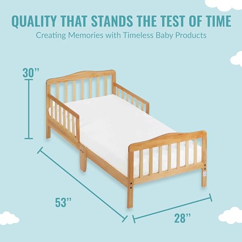 Let your little one transition from a crib to big bed with ease thanks to the Dream On Me Classic Design Toddler Bed! The bed sits low to the floor making getting in and out easy. It comes with two side safety rails and is reinforced for stability with a center leg. All user manuals and assembly tools are provided with the crib at purchase. Its design is classic and minimalist – the solid wooden bed features gently arched head- and foot-boards and smoothly curving rails and beams, making it a beautifully crafted piece of furniture. It is available in non-toxic, elegant finishes, making it perfect to fit in the nursery of your dreams. Safety is always our top priority. The toddler bed is JPMA certified and designed to meet/exceed all applicable ASTM and CPSC standards. It is free of phthalates, latex, lead and BPA and is ergonomic, stable and sturdy. The dimensions are 53 L x 28 W x 30 H inches and it weighs 16.5 lbs. It can accommodate a child of up to 50lbs. Choose any Dream On Me non-toxic, Greenguard certified standard crib mattress for a perfect fit.