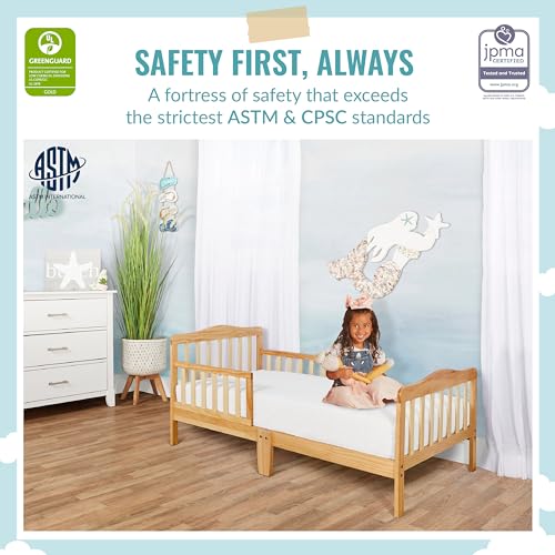 SAFETY FIRST: The toddler bed is JPMA certified and designed to meet or exceed all applicable ASTM and CPSC standards; It is free of phthalates, latex, lead and BPA and its design is ergonomic, stable and sturdy