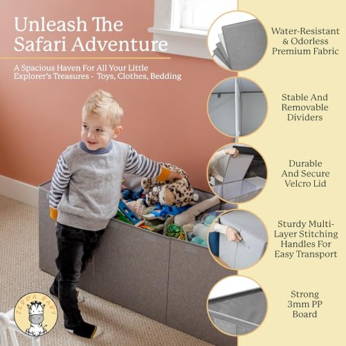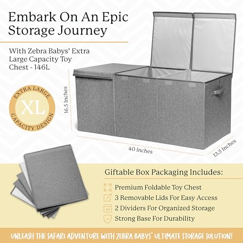 Customize the Interior To Meet Your Needs: The foldable toybox for boys room and girls room measures 40.5 x 14 x 16.5 inches and comes with 2 removable dividers, so you can create up to 3 compartments inside; The lightweight toy organizer also includes 3 matching hook-and-loop fastener lids and carry handles on the sides