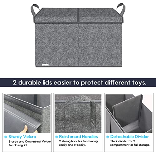 DUSTPROOF & CONSIDERATE DESIGN – The 2 removable flap-top lids can separately protect your kid’s toys, simply open and close. Remove the divider in the middle of the toy bin, it will be one larger organizer. The stylish handles are reinforced with good stitching, comfortable and durable for load bearing.