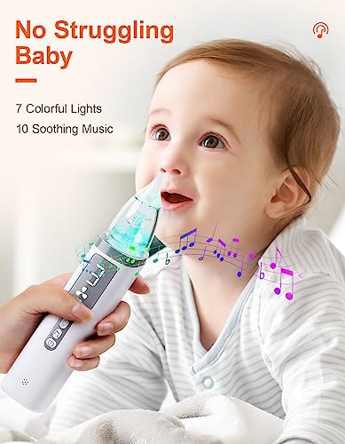 NO STRUGGLING BABY: Sniffling can’t be more relaxed! Our baby nose sucker features 7 colorful lights and 10 soothing melodies that can be turned on or off. The light can distract baby’s attention while music helps calm your little one, making snot sucking much easier.