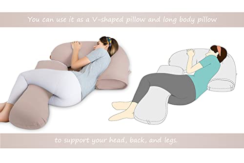 All in One Pillow and Widely Use Pillow. Maternity body pillow support a cushion when you are sleeping, watching TV/ movie, reading, resting, playing games, and working at home. It cradles your body to reduce tossing and turning, providing you a quality sleep and keep your neck, shoulder, back and hip aligned during night. Also, the pillow is foldable into multiple position to elevate your leg to improve blood circulation. Relieving pregnancy swelling is so important for pregnant women.