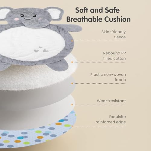 🐘【Foldable and Machine Washable】Our baby animal mat is very easy to clean, all of the mats are machine washable, no color fading. Filling in good quality ensures stable shape after washing for many times. Foldable design baby tummy time mat is easy to store. You can put this portable play mat in your bag or car and take it to anywhere else to your baby plays.